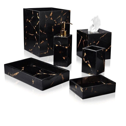 black obsidian, creating a luxurious and elegant aesthetic agate Bathroom Set consisting of six essential accessories is designe to create a coordinated and luxurious bathroom decor. Each item is crafted with or accented by black obsidian, adding a touch of sophistication to your bathroom: