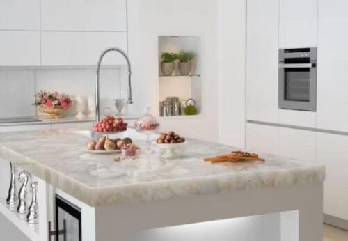the ideal fusion of elegance and functionality with quartz worktops in bathrooms, renowned for their remarkable ability to withstand water. These engineered quartz countertops are perfect for the bathroom because they create an impenetrable barrier against moisture. Quartz doesn’t absorb water like natural stone substitutes do, which keeps mold and mildew from growing and guarantees long-lasting durability. Indulge in tranquility while your bathroom exudes toughness and sophistication.