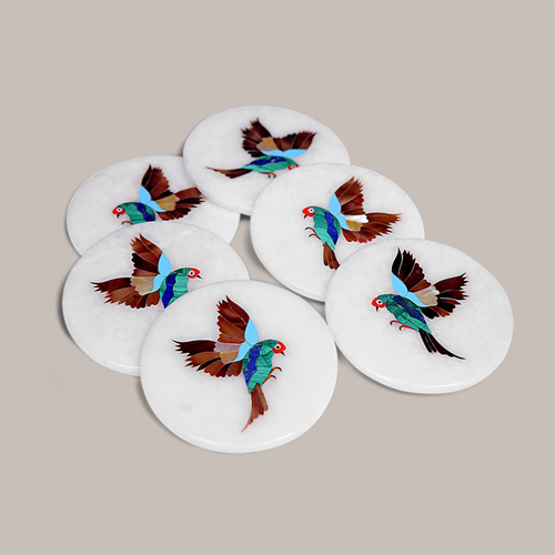 - Craftsmanship: Creating these coaster sets requires a high level of skill and precision. The process involves carefully cutting and shaping both the white marble base and the inlay materials to fit together seamlessly.