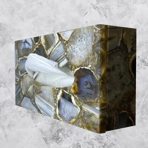 The tissue box is crafted by incorporating agate slices or panels, showcasing the natural bands, swirls, and variations in the stone. The agate pieces are often polished to enhance their luster and reveal the intricate patterns within the stone.
